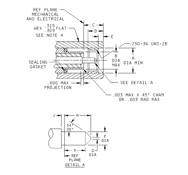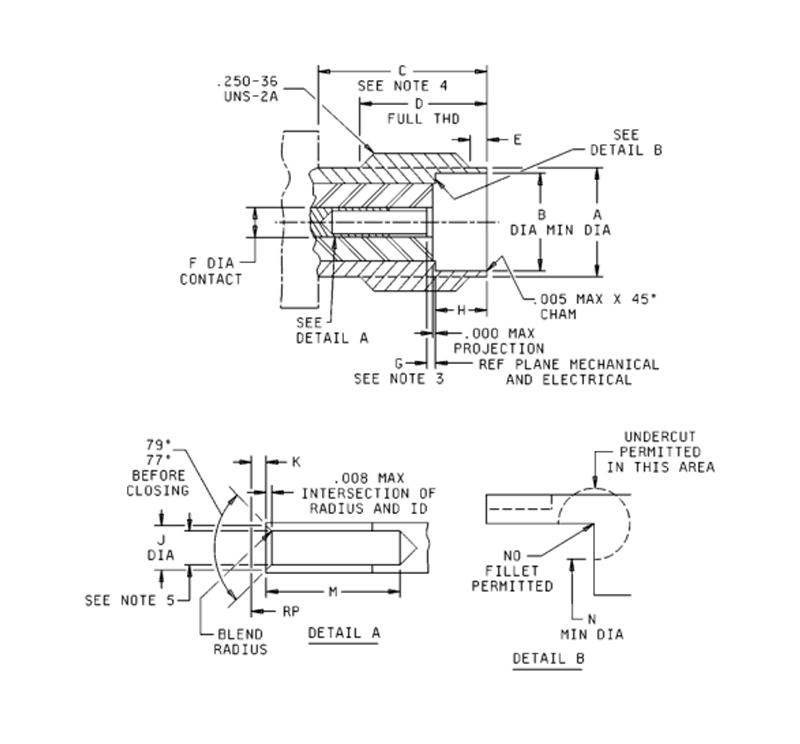 3. Eerder gekwalificeerde onderdelen met een maximale contactuitsparing van 0,030 inch (0,76) zijn niet acceptabel voor gebruik door de overheid. Voorzichtigheid is geboden om te bepalen of er tijdens onderhoud en vervanging van onderdelen een .030 recessieontwerp wordt gebruikt.